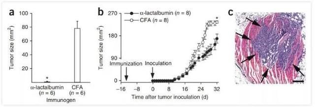 2010年,克利夫蘭診所Lerner研究所的免疫學(xué)家Vincent Tuohy的研究團(tuán)隊在《Nature Medicine》上發(fā)表了題為:An autoimmune-mediated strategy for prophylactic breast cancer vaccination 的研究,結(jié)果顯示,乳腺癌細(xì)胞經(jīng)常表達(dá)一種乳腺特異性分泌乳蛋白——α-乳清蛋白,尤其是在三陰性乳腺癌(TNBC)中普遍表達(dá)。